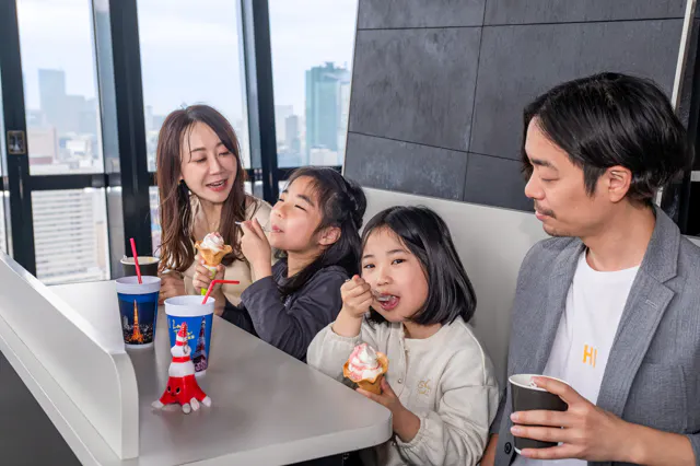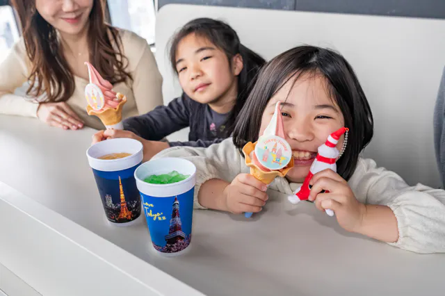 「CAFÉ la TOUR」(カフェ ラ・トゥール)は、オリジナルカップで提供されるドリンクやノッポンのもなかが付いたプレミアムタワーソフトが人気のカフェ。夜は、メインデッキからの夜景を眺めながら、アルコールを楽しむのも良さそうです。