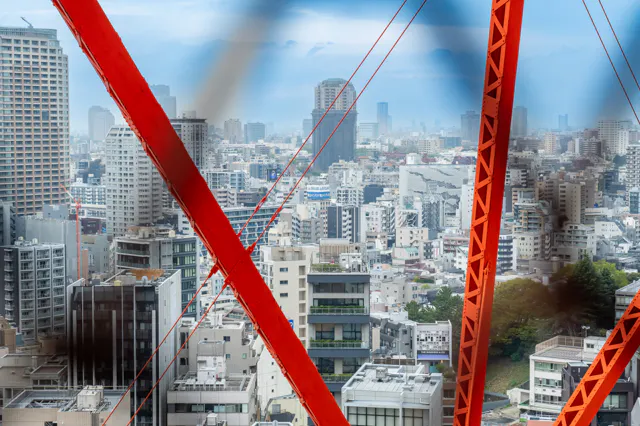 東京タワーの特徴的な赤い鉄骨に囲まれて不思議な気持ち。鉄骨の間からは東京の街並みが見えます。普段、下から眺めるだけでは分からない鉄骨の細かな部品や塗装の質感を肌で感じられるのが外階段の面白いところです。