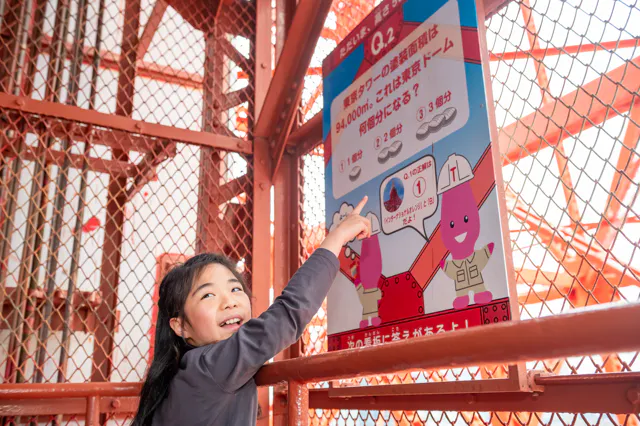 途中には、東京タワーの公式キャラクター・ノッポン兄弟が出すクイズがあります。知っている知識をもとに一生懸命推理する娘。体力も頭もフルに使っていてさすがです。