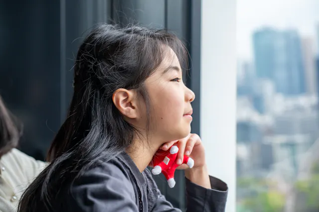 タワオを握りしめながら、遠くを見つめるお姉ちゃん。パパがその様子を隣でそっと写真に収めていました。景色を見て、何を考えていたのでしょう。