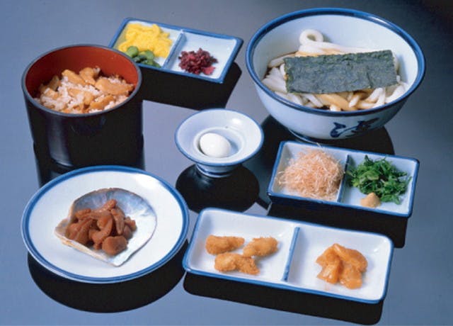 伊勢うどん、貝柱しょうゆ煮、貝柱フライ、貝柱うに和え、うずらのゆでタマゴ、貝柱入り 炊き込みご飯がセットになったメニューです。伊勢うどんとアヤコ貝の貝柱をふんだんに使用した一品となっています。