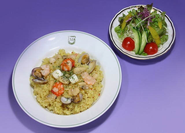 貝柱入りシーフードピラフにサラダが付いた一品。阿波幸自慢のアコヤ貝柱を使用し、小さな子供でも食べやすい美味しいピラフです。