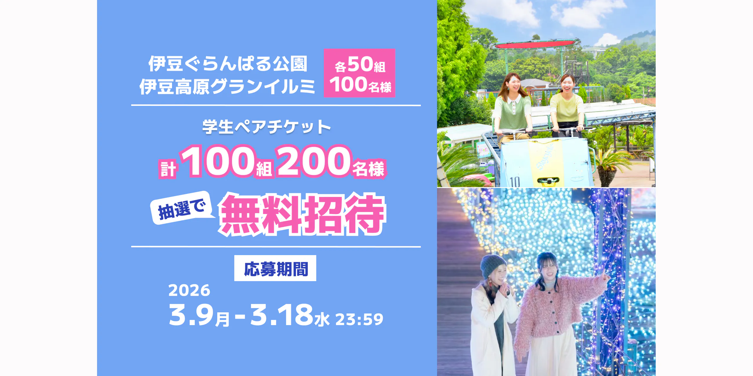 【合計100組200名様をご招待】学生限定!「伊豆ぐらんぱる公園・伊豆高原グランイルミ」ペアチケットが抽選で当たる!限定キャンペーンを実施中